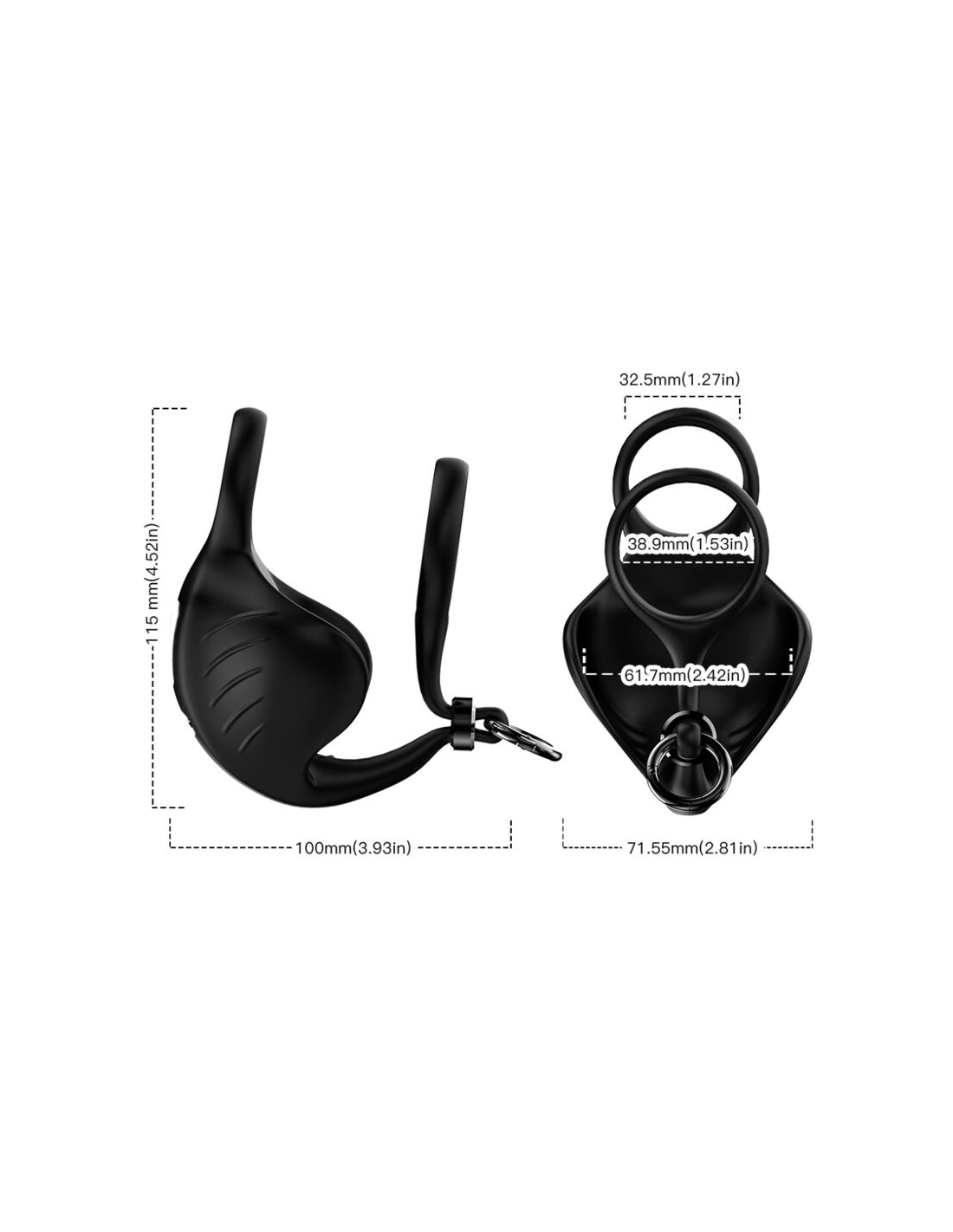 Las dimensiones de 115*100*34 mm hacen que el anillo sea discreto y fácil de manejar, permitiendo que cualquier persona pueda incorporarlo a sus juegos eróticos con total soltura.