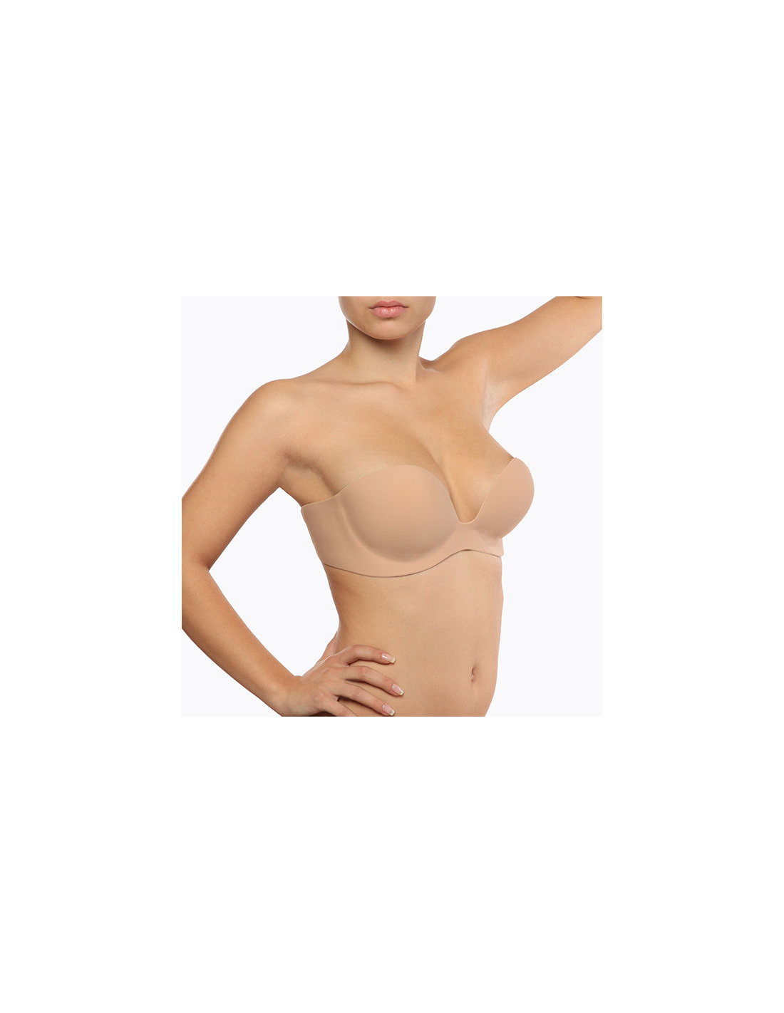 - Coloque suavemente ambas copas del sujetador Gala en sus senos y asegure las almohadillas adhesivas push-up en el lugar correcto.