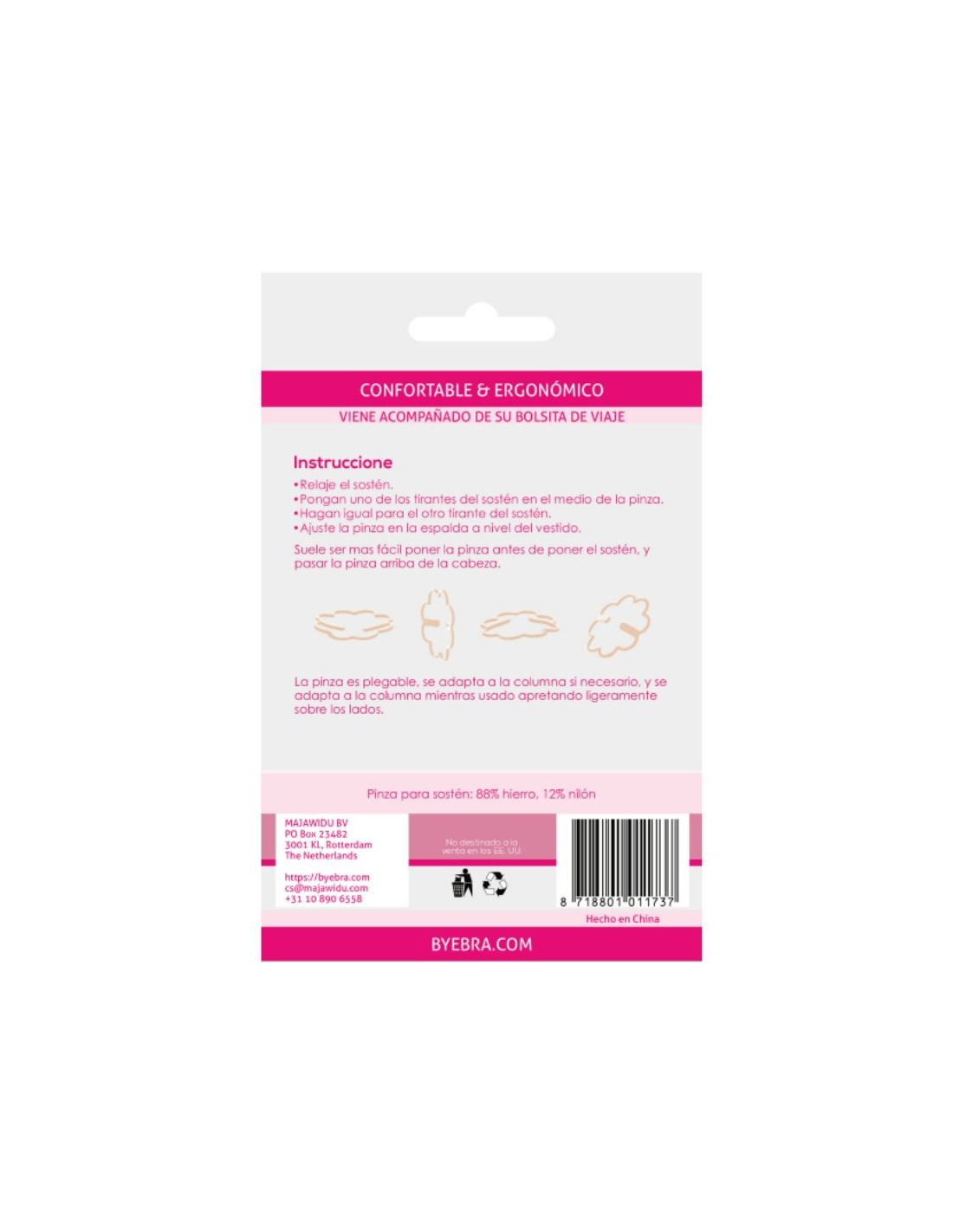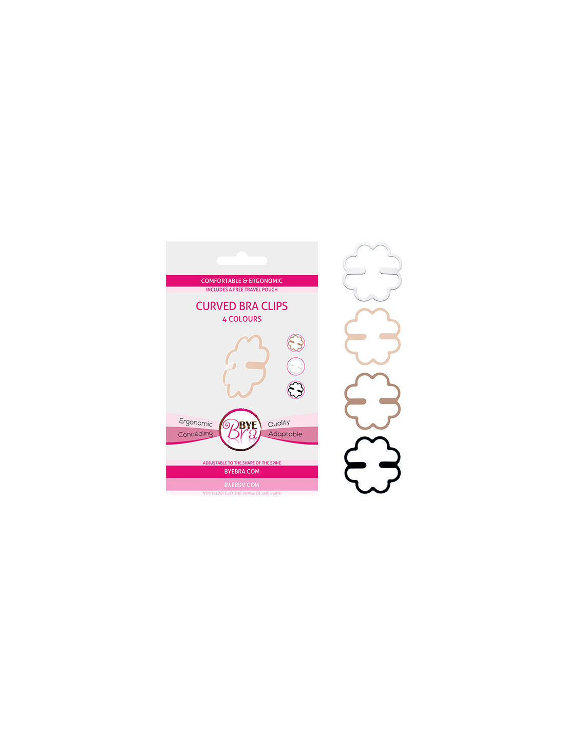 Introduciendo una nueva generación de pinzas para sostenes, Bye Bra eleva los accesorios tradicionales hacia otro nivel. La pinza de Bye Bra es ergonómica y plegable. Puede estirarse y plegarse para adaptarse a la forma de la espalda si necesario. Esconder tirantes de sostenes será mucho mas fácil y comodo como la pinza Bye Bra se adapta a la morfología del usario y casi no se siente. Cada caja contiene cuatro pinzas, cada una de diferente color.