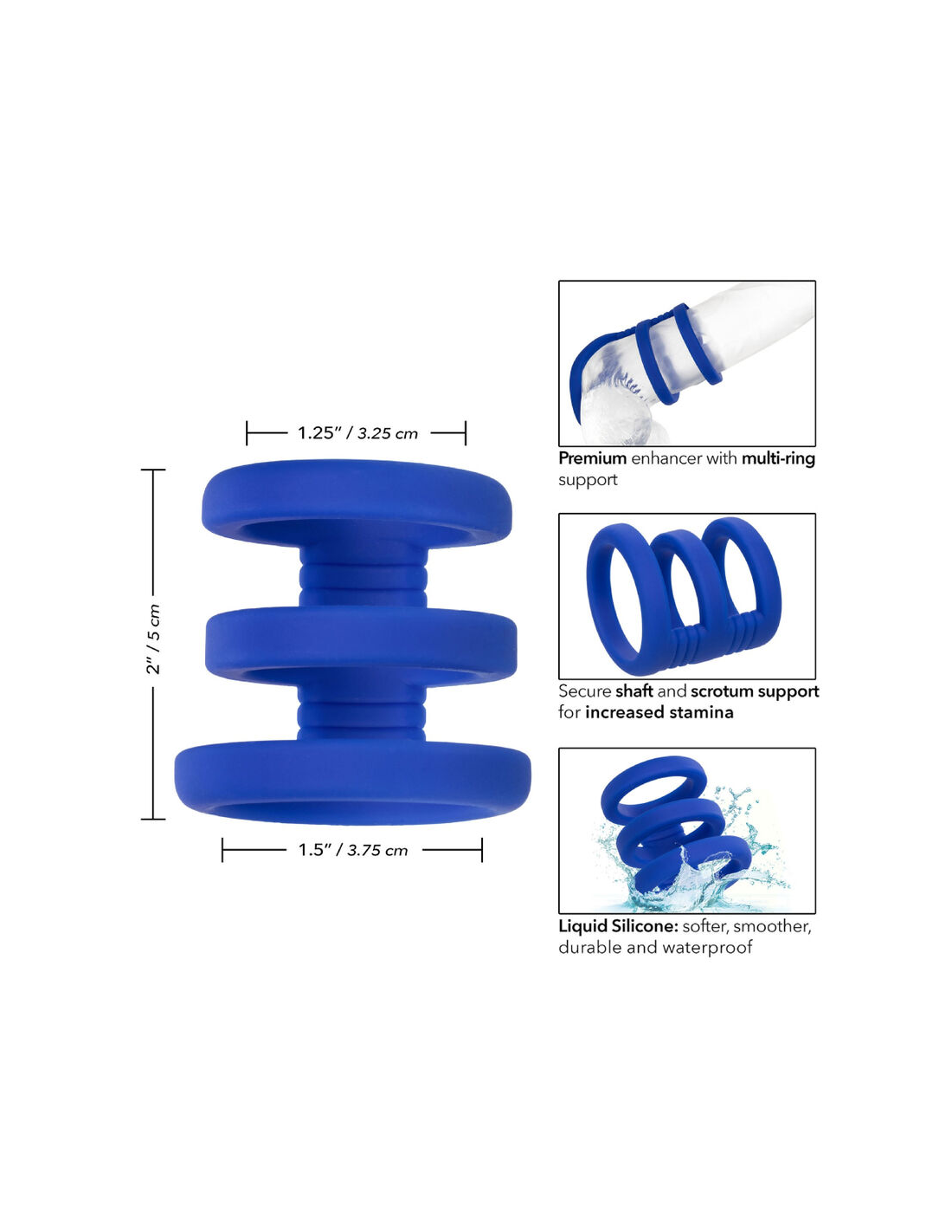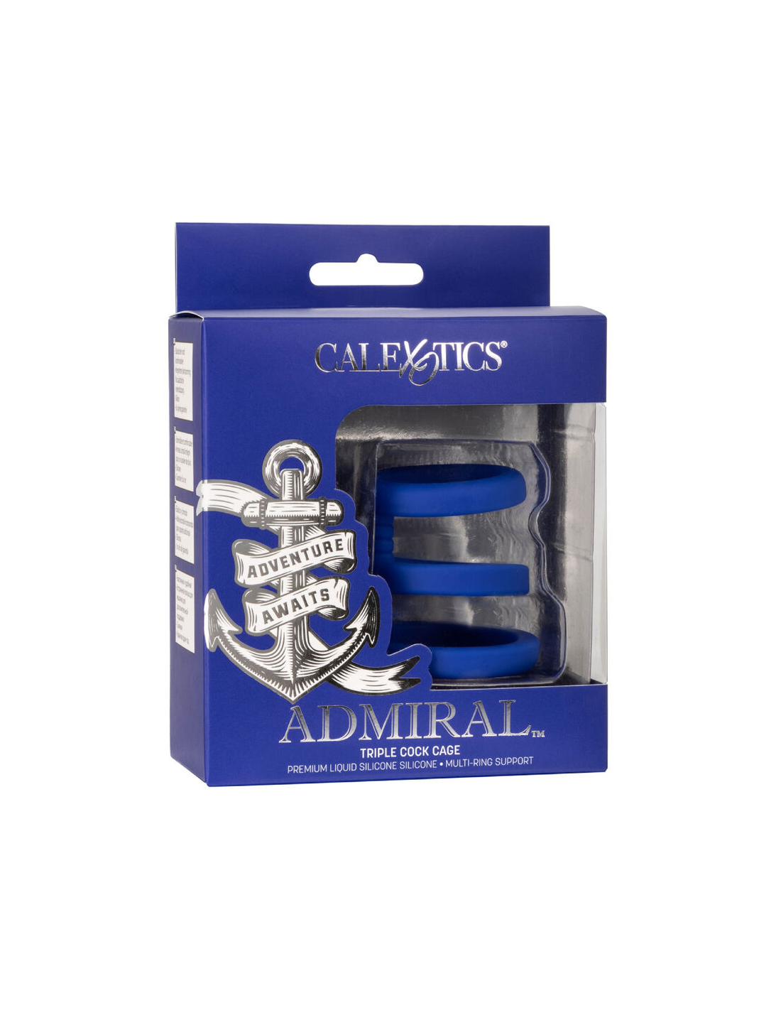 CALEXOTICSExplora nuevos territorios inexplorados de placer con la lujosa Admiral Triple Cock Cage, un potenciador de silicona líquida con soporte de múltiples anillos para aumentar el rendimiento.