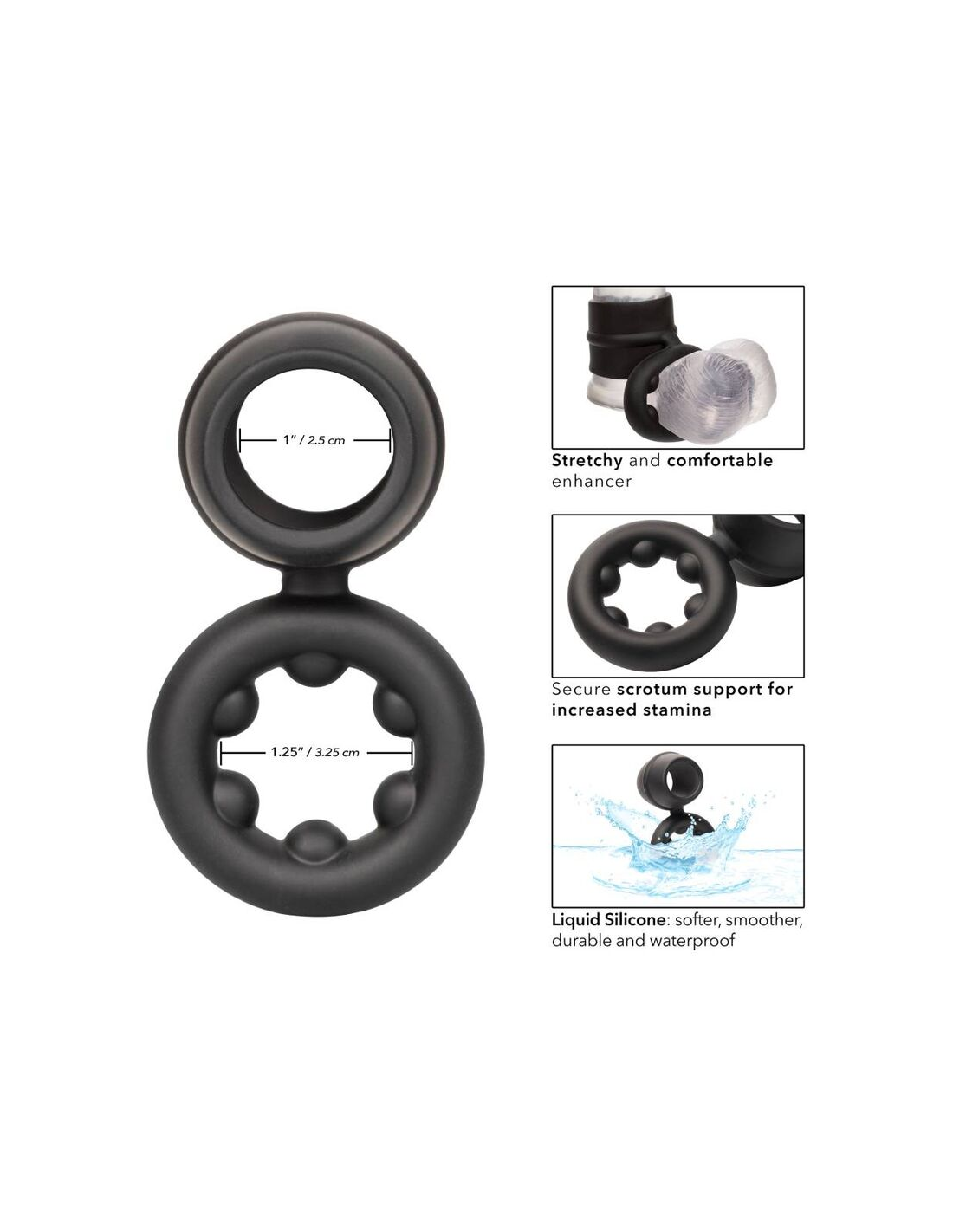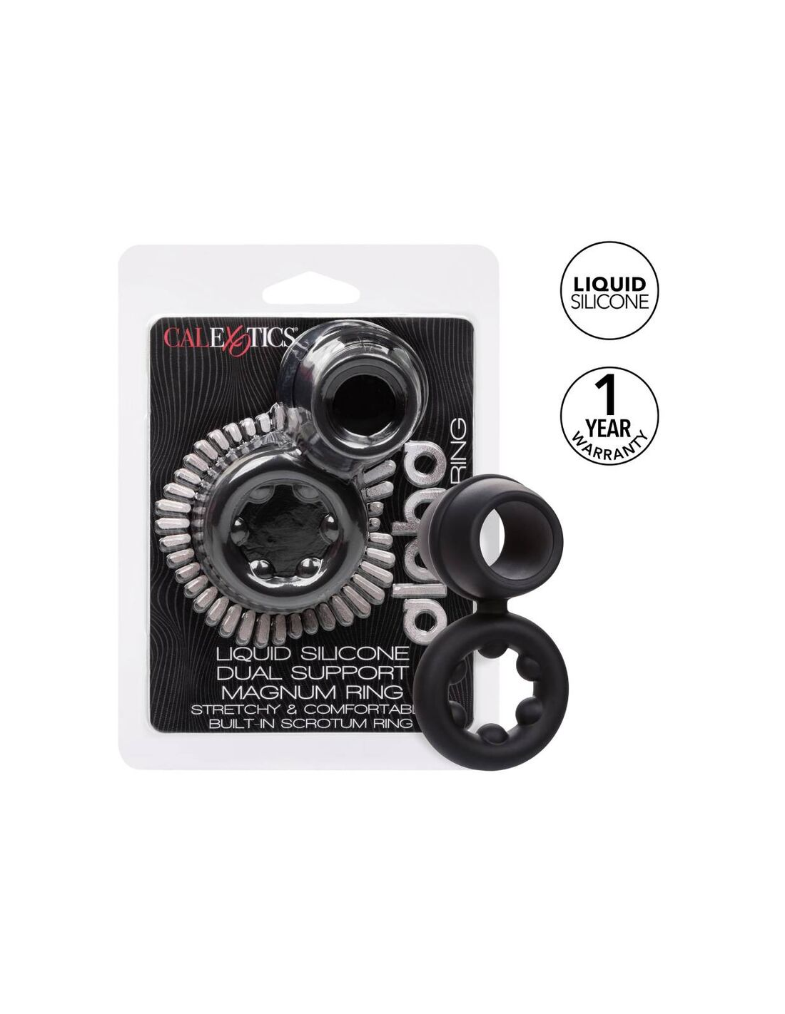 CALEXOTICSDesde principiantes boquianos hasta expertos eróticos, el anillo de doble magnum de silicona líquida alfa lo envolverá con el placer con el anillo de potenciador ultra lujoso y ultra elástico. El anillo juguetón está hecho de una silicona líquida ultra estirada con un diseño atrevido de doble anillo. Este anillo de polla elástico y cómodo está hecho para aumentar la resistencia, mejorar la sensibilidad y ofrecer un soporte de erección superior. El anillo de soporte de escroto duradero le permite disfrutar aún más en una resistencia aumentada. Busque una experiencia de placer explosiva mientras el lujoso anillo se aprieta con cada movimiento. La silicona líquida premium es suave, lisa, duradera e impermeable .