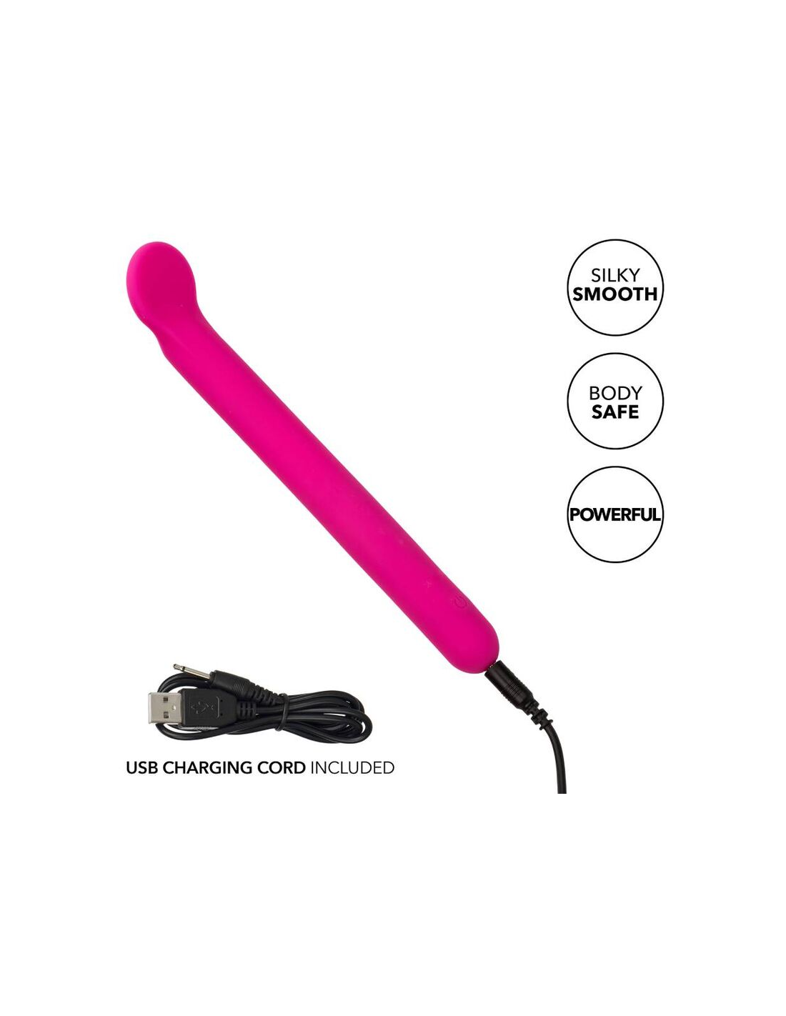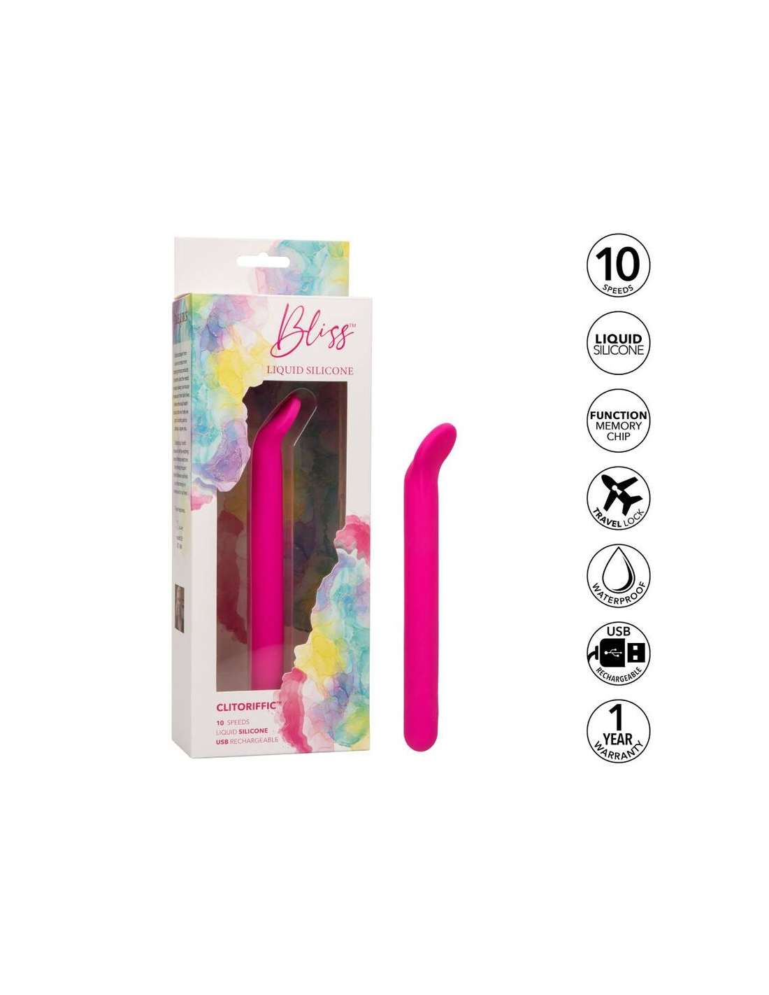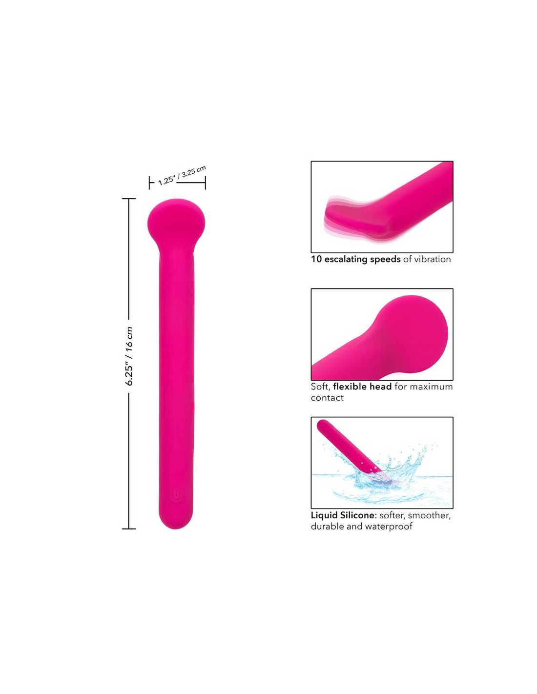 CALEXOTICSDisfrute de un paraíso de placer con el clítoris de silicona líquida de felicidad. Este ambiente sensacional presenta una punta flexible y plana, un diseño de silicona líquida formadora de cuerpo y 10 funciones potentes de vibración. La punta de contacto suave y máxima y el cuerpo de silicona 100% líquido son perfectos para acariciar puntos dulces internos y externas. Obtenga juguetón con cada aumento de las 10 velocidades incrementales de vibración con el botón de control de fácil toque. Control sin esfuerzo El placer puro con un botón de silicona de fácil toque y mantenga presionada durante 3 segundos para encenderse o desactivarse. La silicona líquida ultra plano es ideal para explorar puntos dulces sensuales y puntos de placer íntimos con facilidad. Use el control suave de un solo botón para disfrutar de hasta 110 minutos de placer vibrante. Cargue su pasión en solo 1,5 horas conectando el cable USB proporcionado al puerto de carga de auto-selección en la base del masajeador .