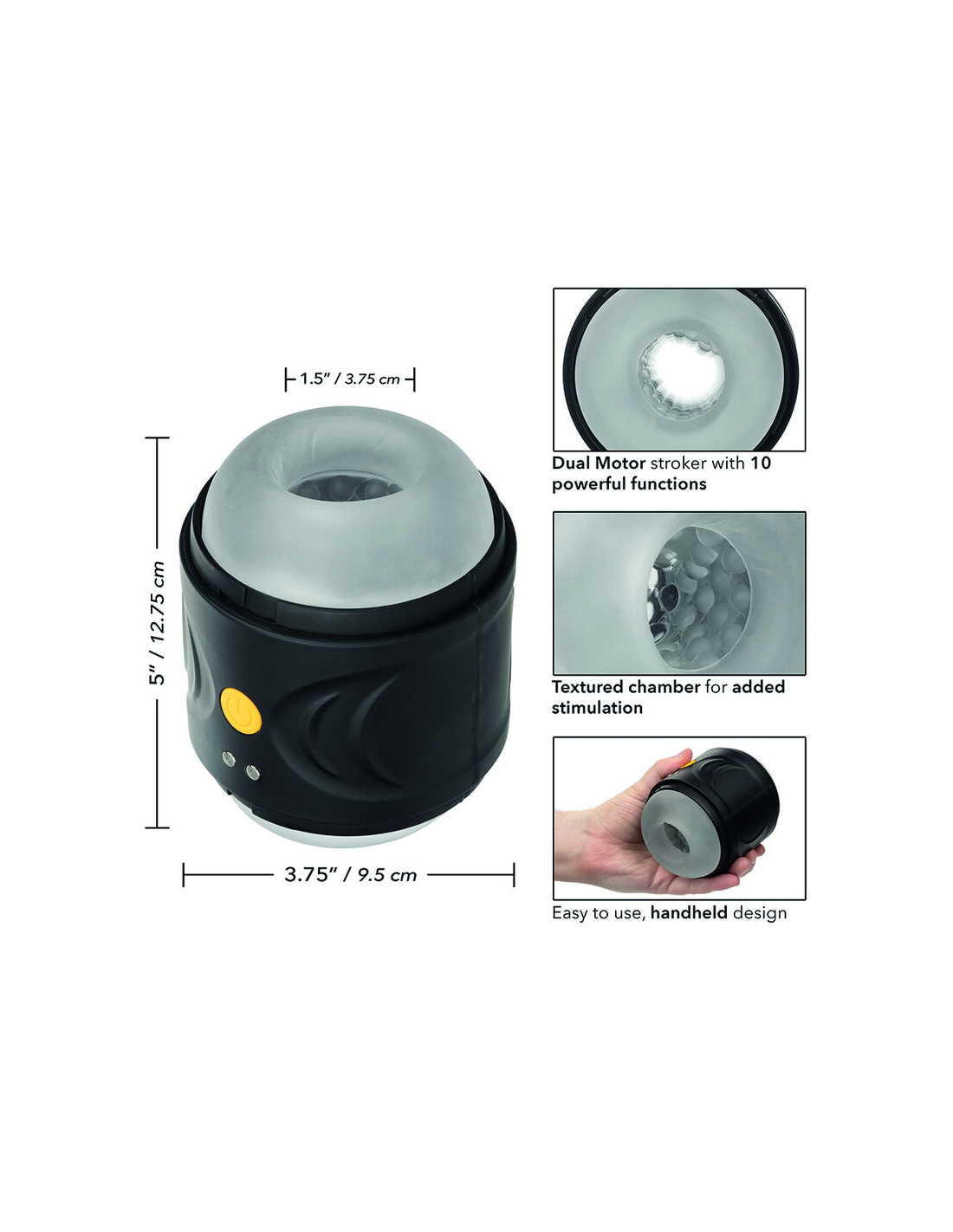 El diseño de doble entrada ofrece diversidad a la experiencia, permitiendo elegir entre dos cámaras para mayores niveles de estimulación. Además, esta funcionalidad se complementa con tapas extraíbles que aseguran un almacenamiento higiénico y limpio del producto. La atención al detalle no se detiene ahí. Cuenta con una cámara texturizada que se adapta perfectamente al contorno del cuerpo y genera una sensación de lujo y confort.