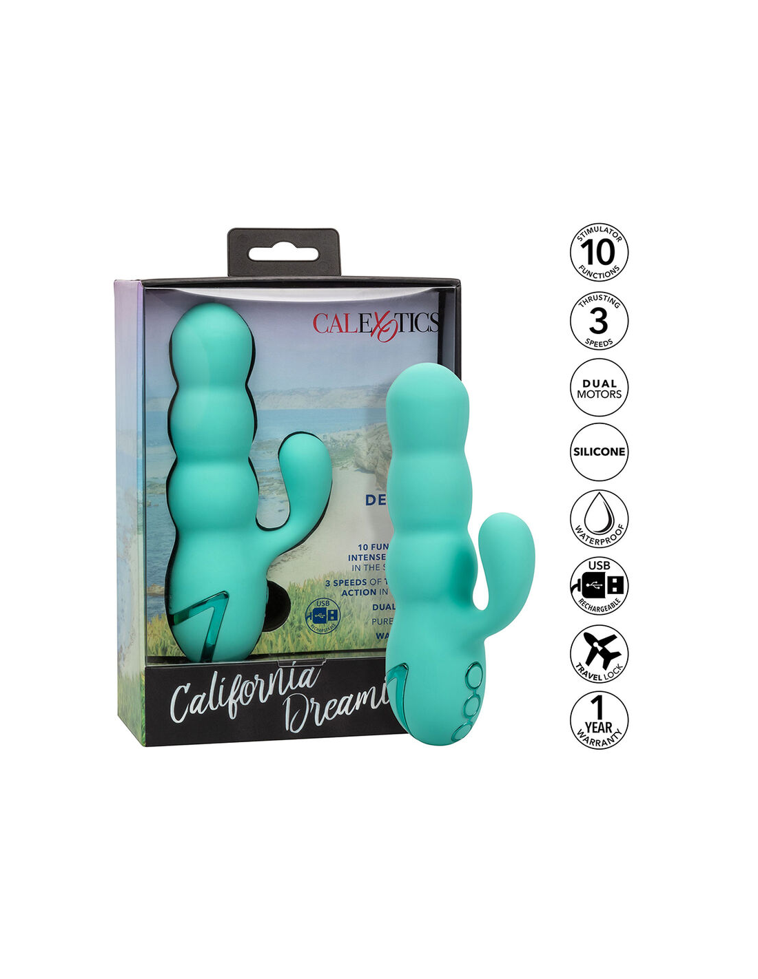 ¿Estás lista para llevar tus momentos íntimos al siguiente nivel? El Del Mar Diva Vibrador Conejito Verde Agua de la prestigiosa línea California Dreaming de CalExotics ha llegado para transformar tus experiencias de placer. Este vibrador no es solo un juguete, es una herramienta de exploración personal diseñada con las últimas innovaciones en bienestar sexual.