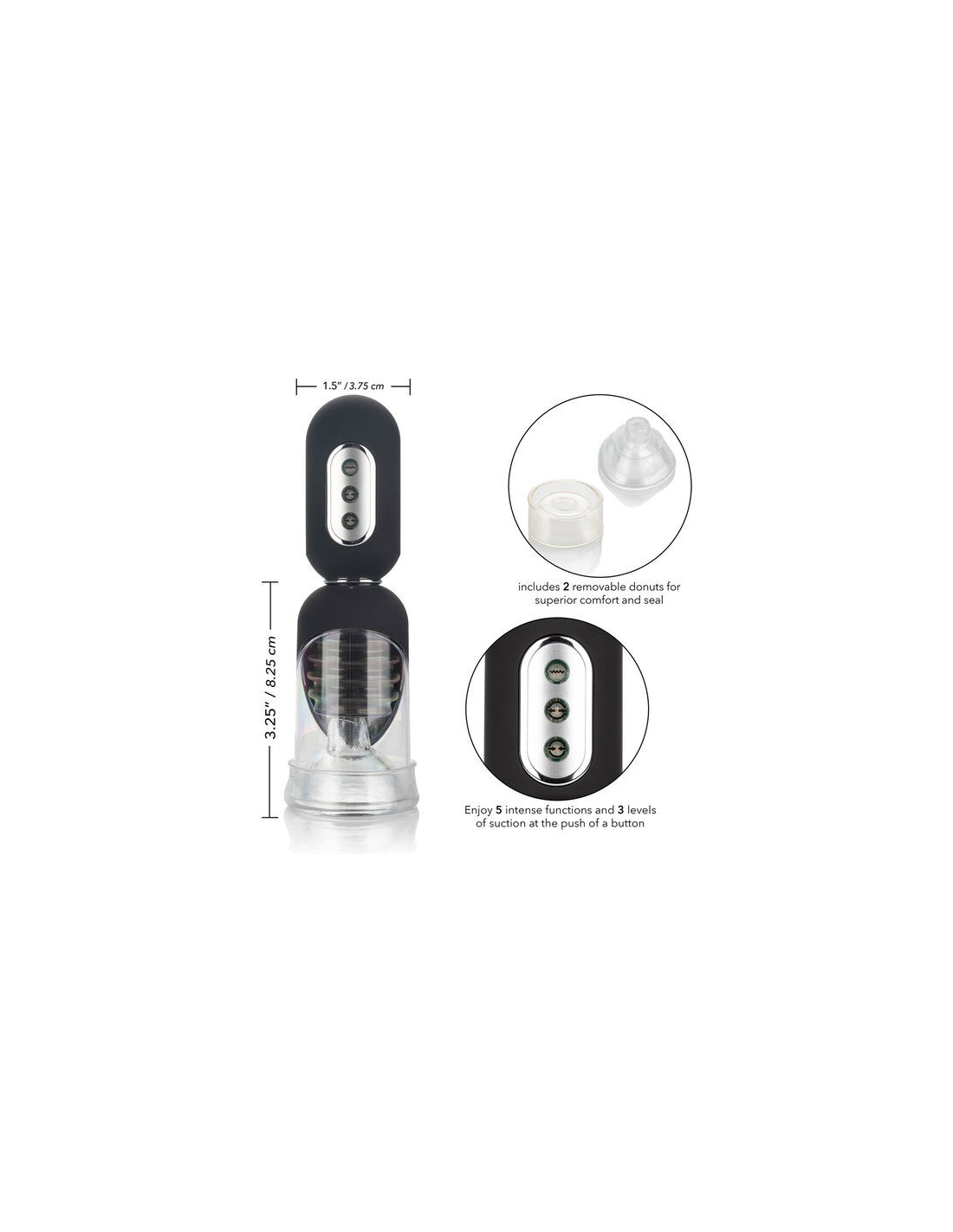 Disfruta de una poderosa succión y un sello superior con dos anillos intercambiables únicos. Usa el anillo simple para tu sesión de bombeo regular y el anillo ultra-apretado para la estimulación intensa.