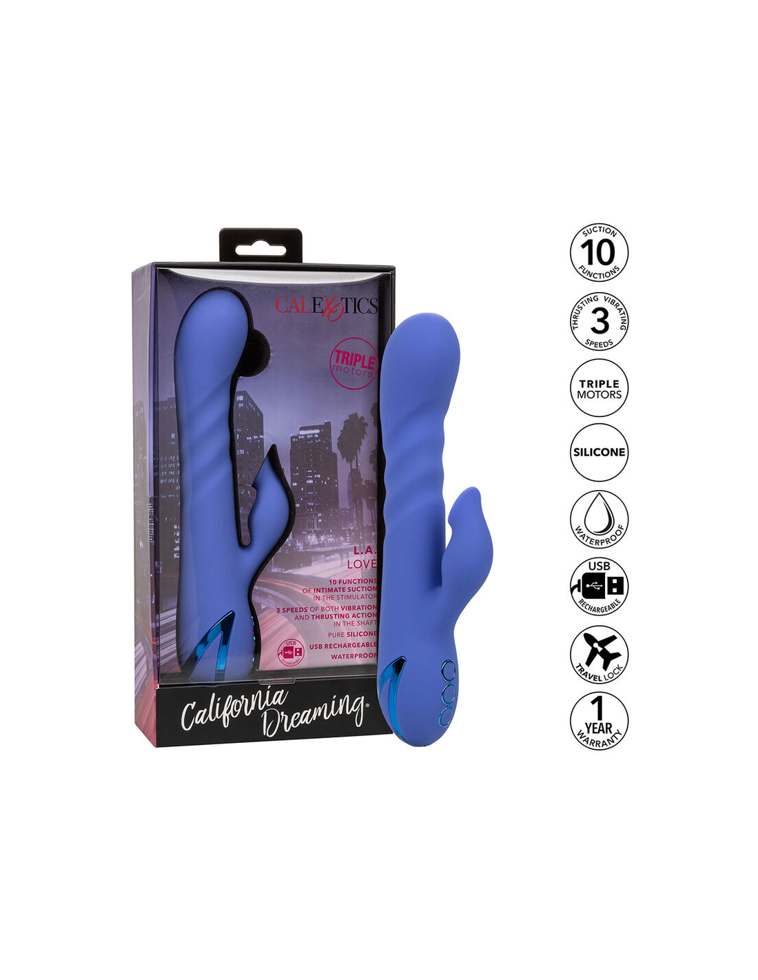 CALEXOTICSDescubre el LA Love de CalExotics, un vibrador y succionador con 10 funciones de succión y 3 velocidades de vibración. Compra ahora y transforma tu placer.