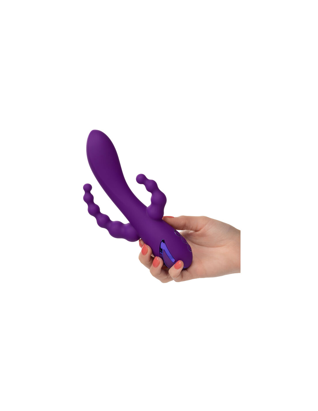 - Potente masajeador de triple acción con vibración en eje, estimulador y cola