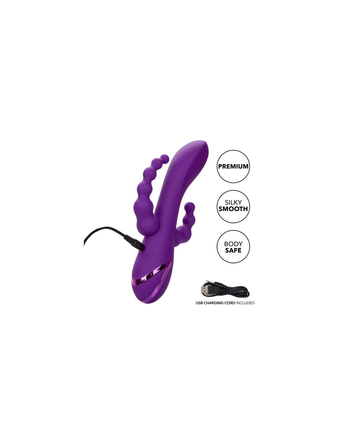 CALEXOTICSEntrégate a tus fantasías más salvajes con el California Dreaming Long Beach Bootylicious. Experimenta el placer como nunca antes con el potente masajeador de triple acción con eje, cola y estimuladores. El potente masajeador de doble penetración utiliza 3 velocidades de vibración a través del eje curvado sensualmente para una penetración provocativa en el punto G.