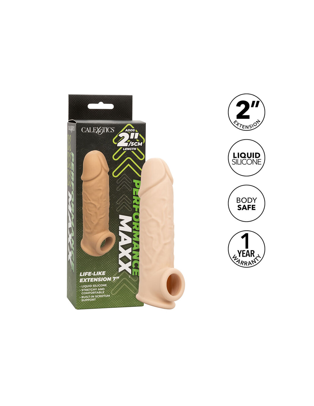 CALEXOTICSLlévelo a nuevas longitudes con la extensión Performance Maxx Life-Like de 7”. La funda realista con diseño hueco agrega 2 pulgadas 5 cm a su longitud para una experiencia de placer mejorada. La correa para el escroto incorporada y la funda gruesa brindan mayor soporte para la erección y mayor resistencia para prolongar e intensificar el placer para ambos socios. Aumente su placer y nunca se conforme con menos cuando se trata de tamaño, nuestro extensor súper elástico con correa de soporte para el escroto hará que usted y su amante anhelen más, más, más. Nuestro potenciador súper elástico se estira para adaptarse y facilitar su uso. La silicona líquida de primera calidad no tiene perfume, ftalatos y no necesita mantenimiento para mantener los puntos más sensibles felices y saludables.