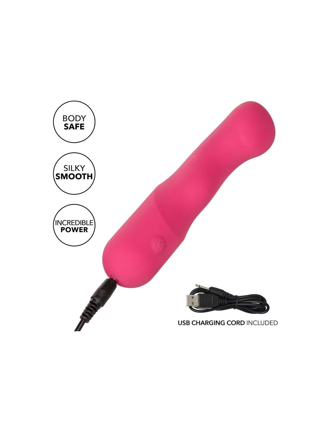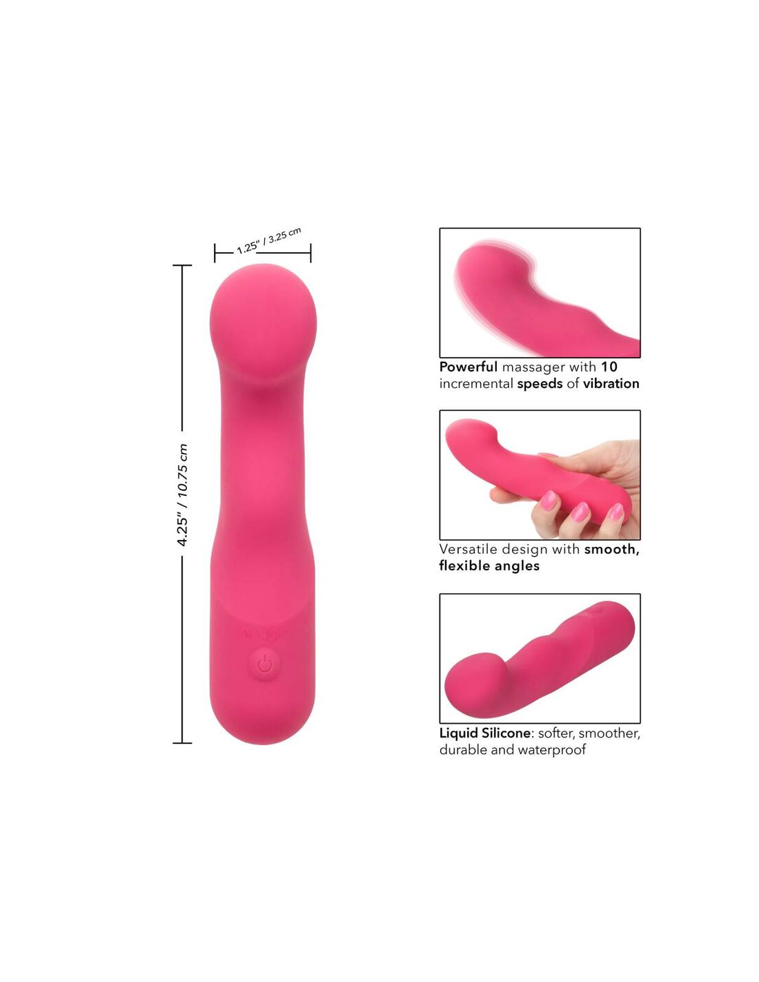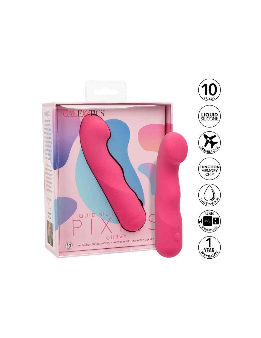 CALEXOTICSEl Curvy Liquid Silicone Pixies está diseñado para ofrecer una sensación de sacudida de rodilla a sus puntos de placer favoritos. La punta en ángulo flexible, el diseño de doble cara y las 10 velocidades emocionantes de vibraciones hacen que este sea el compañero de viaje perfecto. El masajeador curvo se ajusta en su mano para permitirle entregar tentalización precisa y emocionar con vibraciones contorneadas. Obtenga juguetón con cada aumento de las 10 velocidades incrementales de vibración con el botón de control de fácil toque. Control sin esfuerzo El placer puro con un botón de silicona de fácil toque y mantenga presionada durante 3 segundos para encenderse o desactivarse. La silicona líquida ultra-plush y la punta única flexible son excelentes para explorar puntos dulces sensuales y puntos de placer íntimos con facilidad. Con una forma suave y una superficie flexible, podrá disfrutar de vibraciones emocionantes desde cualquier ángulo que desee. Use el control suave de un solo botón para disfrutar de hasta 110 minutos de placer vibrante. Cargue su pasión en solo 1,5 horas conectando el cable USB proporcionado al puerto de carga de auto-selección en la base del masajeador. El tamaño discreto del masajeador delgado lo convierte en el compañero de viaje perfecto, lo que te permite adoptar el placer radiante donde te lleven tus fantasías. 10 velocidades incrementales de vibración