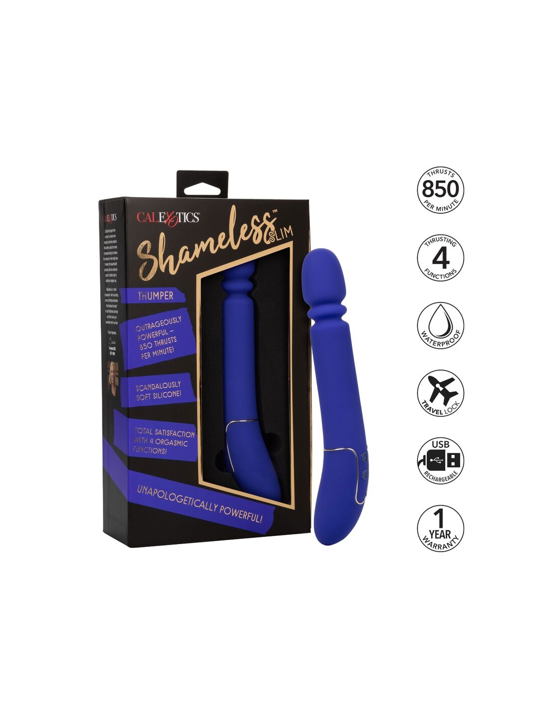 CALEXOTICSEl Shameless Slim Thumper de CALEXOTICS combina potencia extrema, diseño ergonómico y materiales seguros para una experiencia de placer única. Con 850 empujes por minuto y 4 funciones, redefine el significado de la intensidad. ¡Hazlo tuyo hoy mismo!