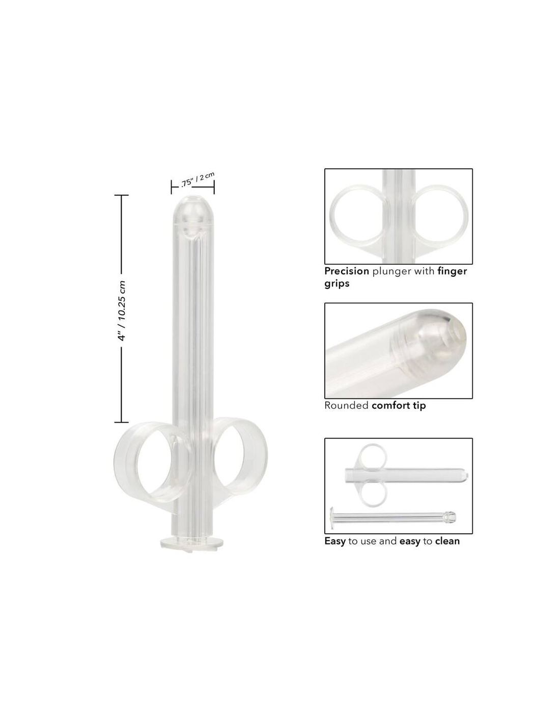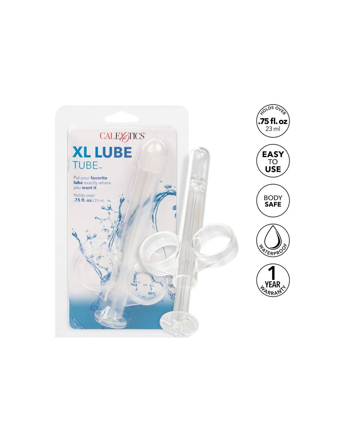 CALEXOTICSReutilizable, recargable y fácil de limpiar, el tubo de lubricante XL es un tubo de dispensación de lubricante que le permite lubricar con precisión punta y tiene hasta 0.75 flores de lubricante. Para entregar una deliciosa lubricación a la mancha correcta, el tubo de lubricante XL tiene un eje delgado, punta redondeada y cuerpo sin costuras. El tubo delgado está equipado con dos bucles de los dedos y un émbolo fácil de usar que facilita el control del flujo de lubricante. Simplemente llene el tubo con el líquido o lubricante elegido y use la punta delgada para entregar la dosis perfecta a la mancha correcta cada vez. Este tubo es fácil de usar y fácil de limpiar. Antes y después de cada uso, lave el tubo interna y externamente con agua tibia y jabón, luego desinfecte con el limpiador de juguetes universal .