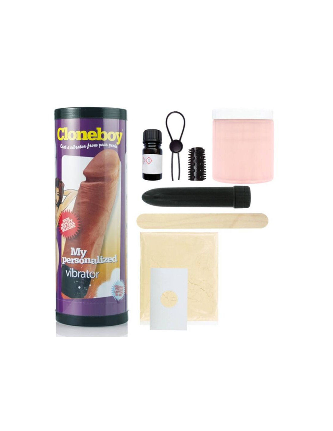 El kit Cloneboy Cast Your Own Vibrator contiene todos los elementos necesarios para hacer una copia vibrante de goma de silicona de su pene, ya sea solo o junto con su pareja. El Cloneboy no contiene yeso que pueda irritar la piel y utiliza un material de moldeo probado médicamente hecho de algas naturales.