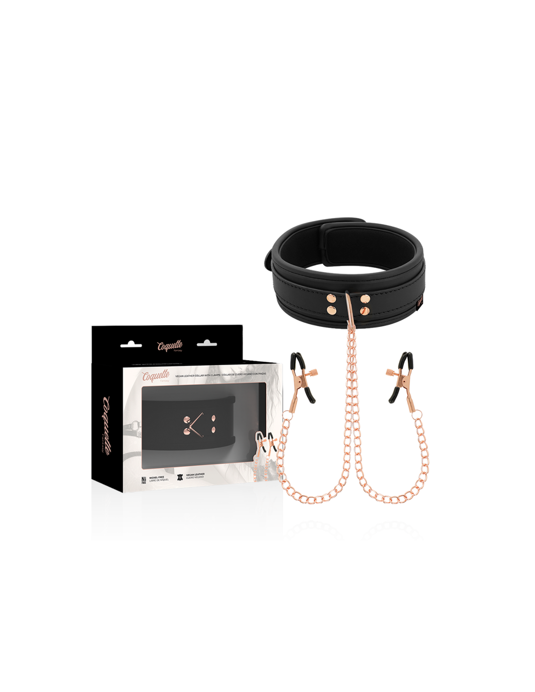 COQUETTE FANTASYDescubre el FANTASY COLLAR CON PINZAS PEZONES, el collar de cuero vegano con pinzas ajustables para pezones. Ideal para explorar nuevas sensaciones en el BDSM con comodidad y estilo. Compra ahora y disfruta de un placer incomparable.