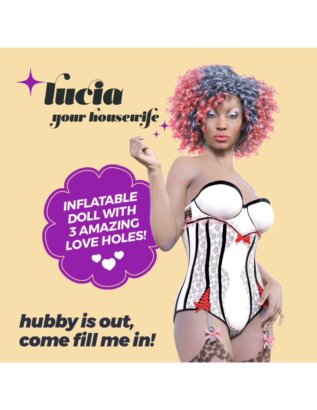 Lucia la Ama de Casa, la muñeca inflable de tamaño real con tres puntos de penetración, está diseñada para satisfacer tus fantasías. Compra ahora y descubre el placer incomparable que solo ella puede ofrecer.