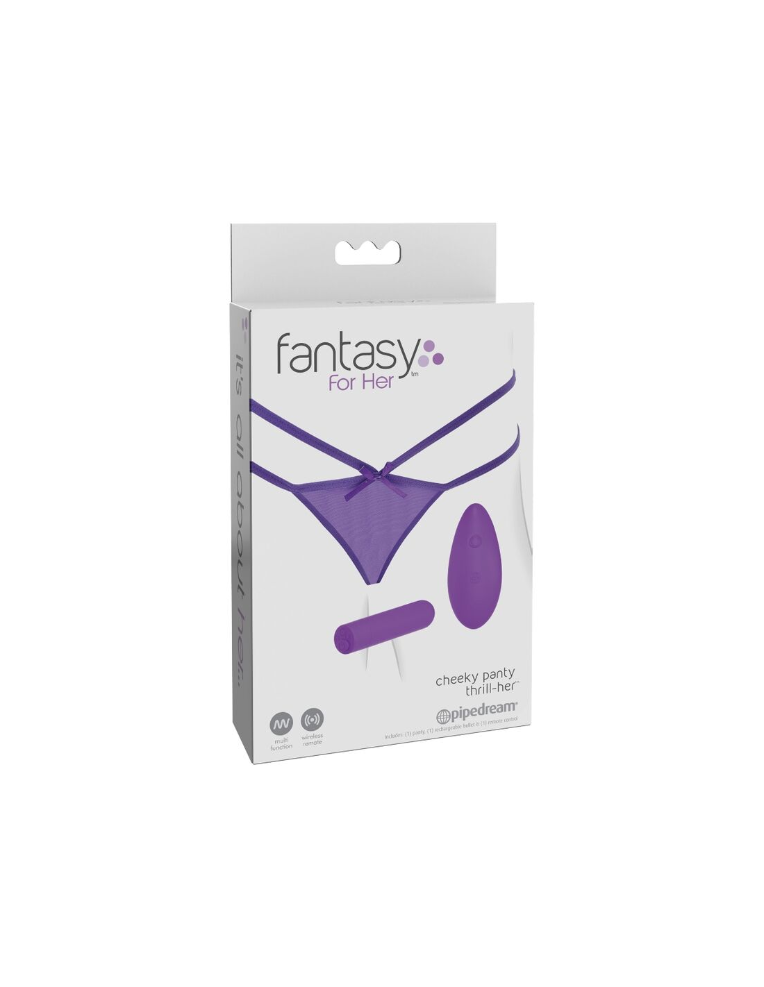 FANTASY FOR HEREsta noche sería una noche que siempre recordaría. Había disfrutado de su largo baño de burbujas y se había aplicado su loción favorita con sensuales caricias. Era el momento de ponerse su Tanga con Vibración Cheeky Panty. Deslizó el tanga violeta por sus piernas. El material transparente era increíblemente sexy y sensual contra su piel desnuda. Le gustaban los detalles adicionales que decoraban el tanga, como sus correas, que la quedaban mucho mejor que su costosa lencería y la hacían lucir aún más seductora. Ah, le encantaba su accesorio favorito, el masajeador en miniatura, que colocó dentro del bolsillo secreto que su tanga escondía. Había elegido esta pequeña prenda para dar a su amante una noche memorable.