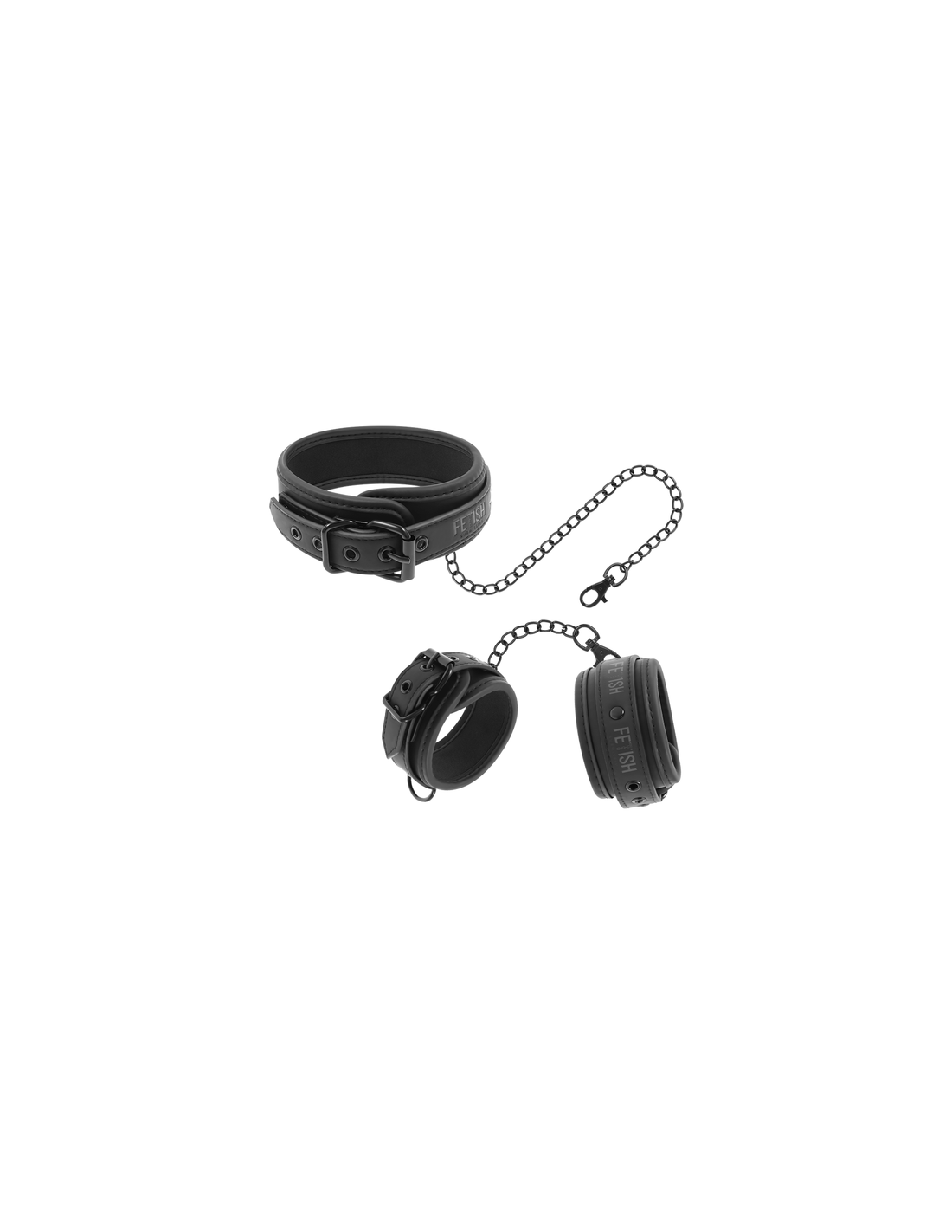 El set incluye, Esposas para muñecas + accesorio para cuello, unión de inmovilizado fijo + cadenas.