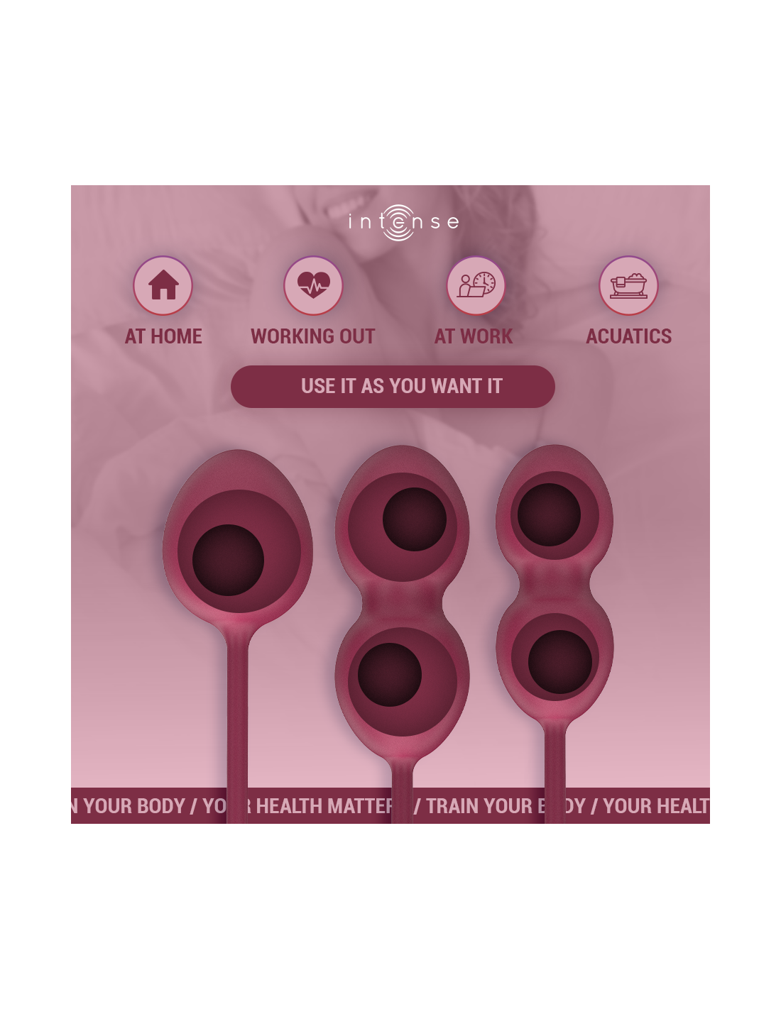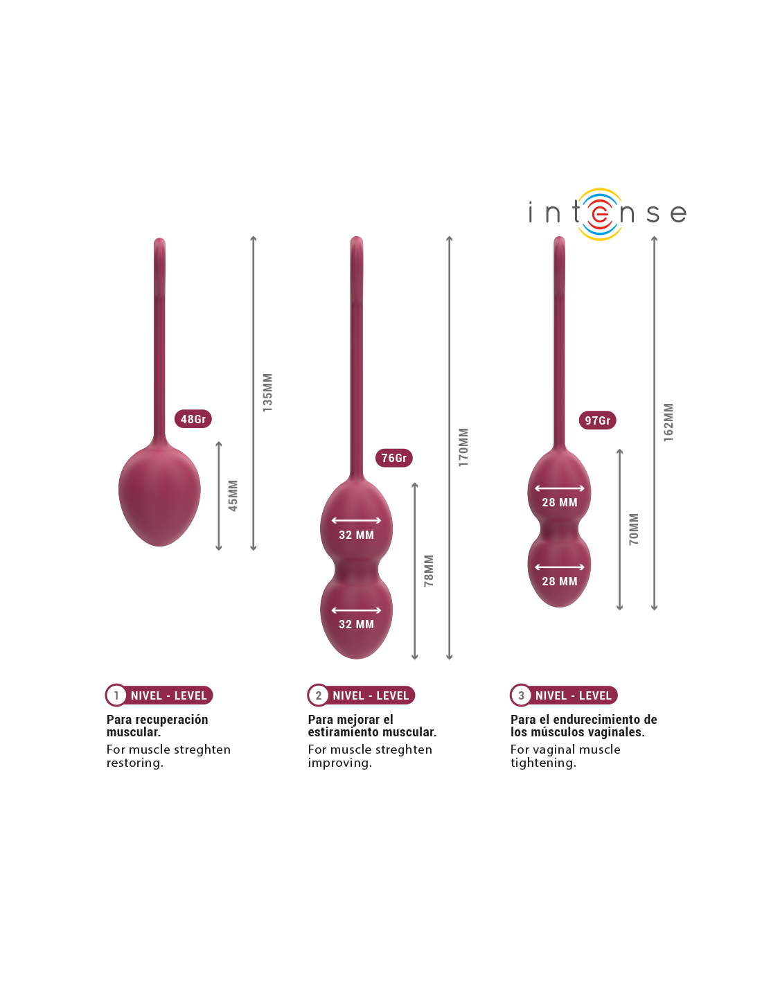 - Pack completo de 3 bolas Kegel: cada una con un peso y tamaño diferente para avanzar progresivamente.