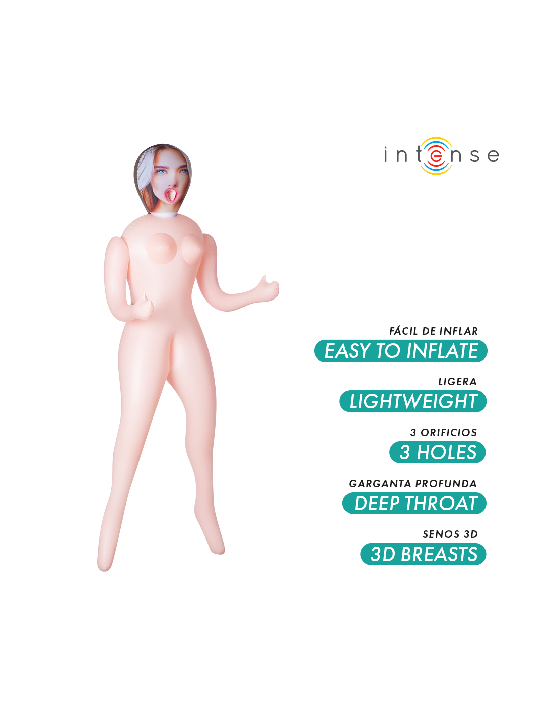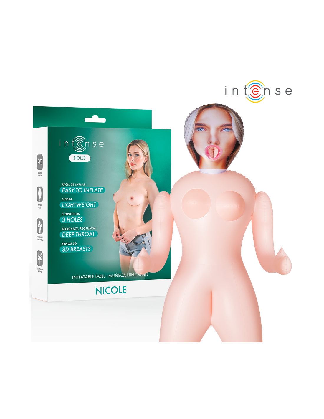 Descubre el placer sin límites con Nicole, la muñeca hinchable de Intense Dolls que combina realismo, comodidad y diversión en un diseño ligero y fácil de usar. Con sus tres orificios funcionales y sus senos 3D realistas, ofrece una experiencia sensual completa para disfrutar en solitario o en pareja.