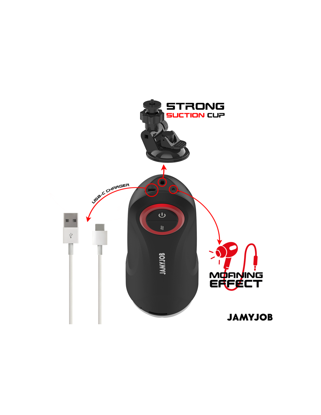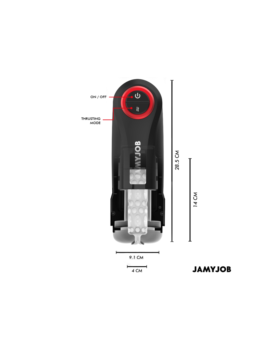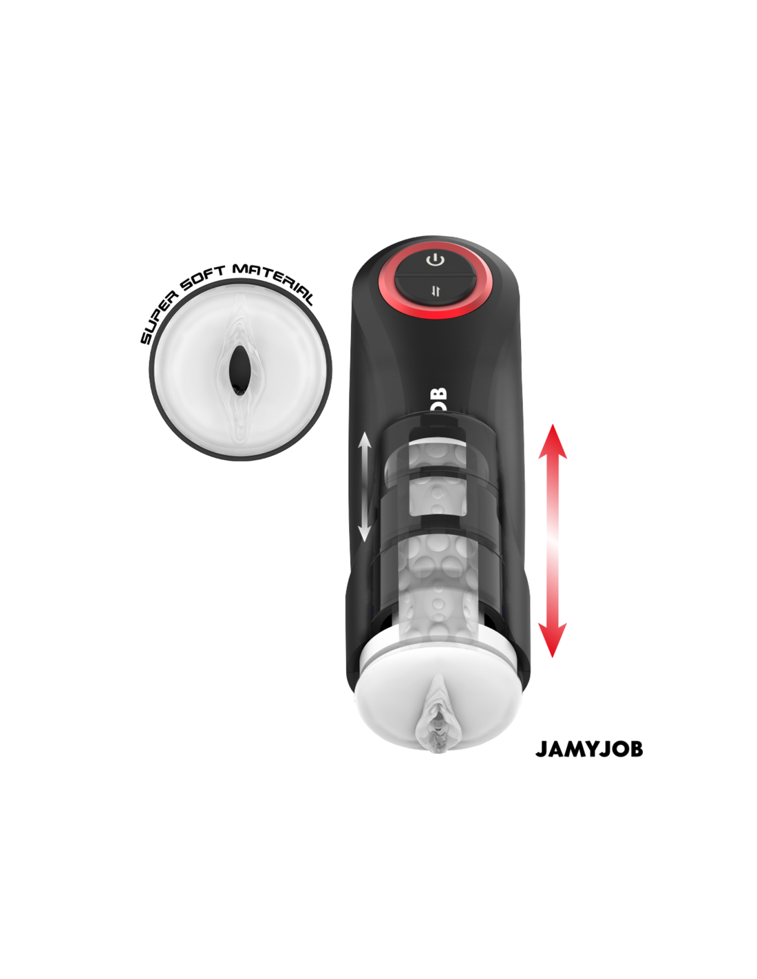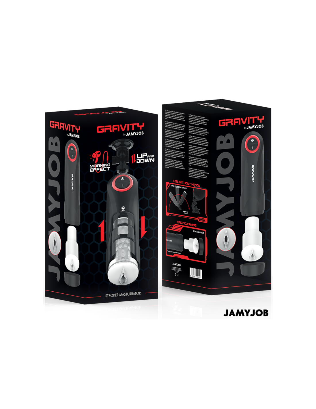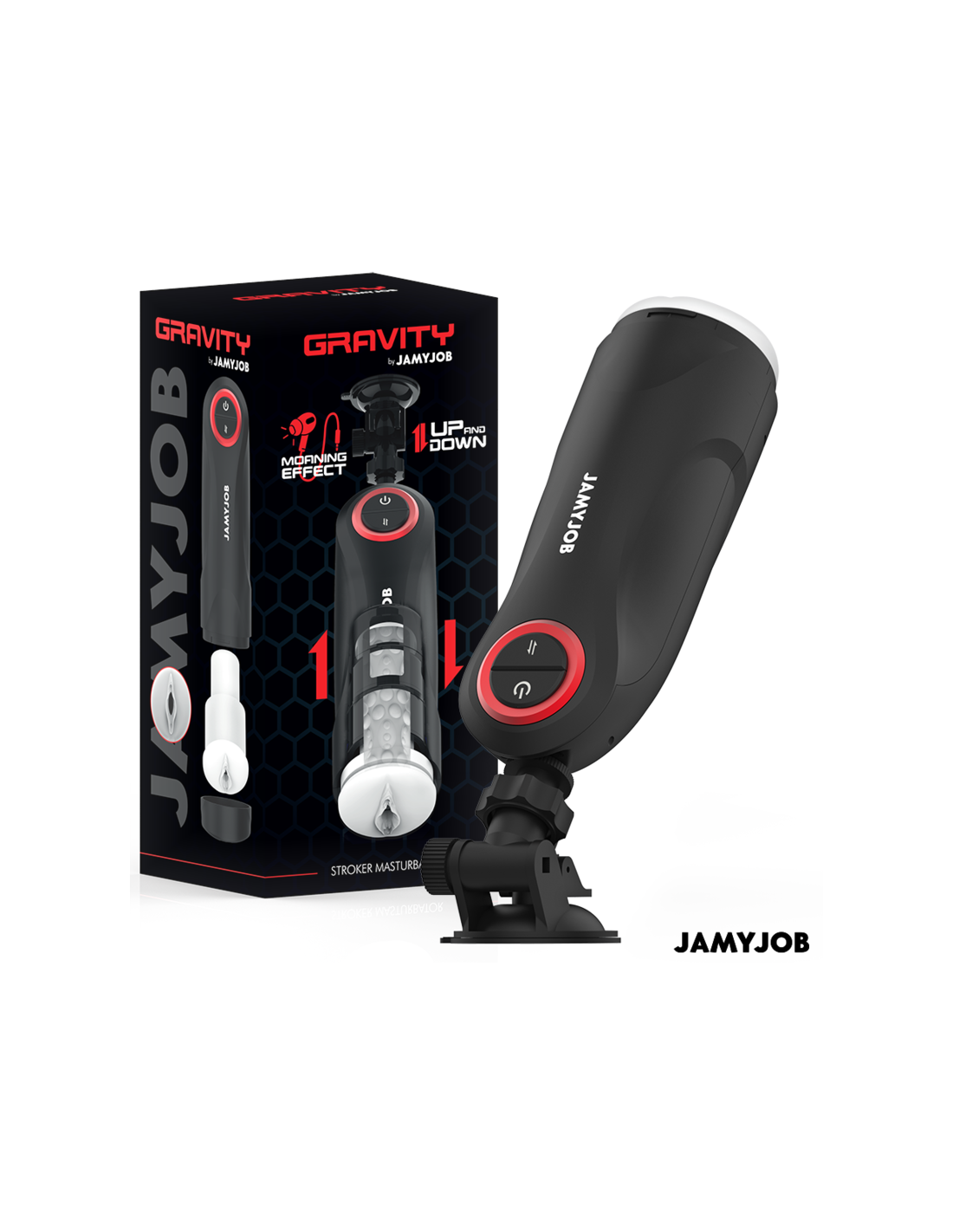 JAMYJOBEl masturbador automático para hombre GRAVITY de la marca JAMYJOB es un dispositivo innovador y elegante, diseñado para proporcionar una experiencia estimulante y placentera de alta calidad. Con un diseño en color negro que destaca por sus detalles en rojo, este masturbador combina estética y funcionalidad en un solo producto.