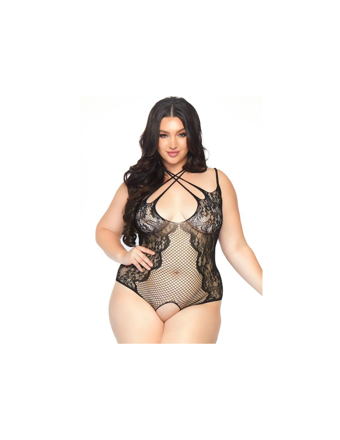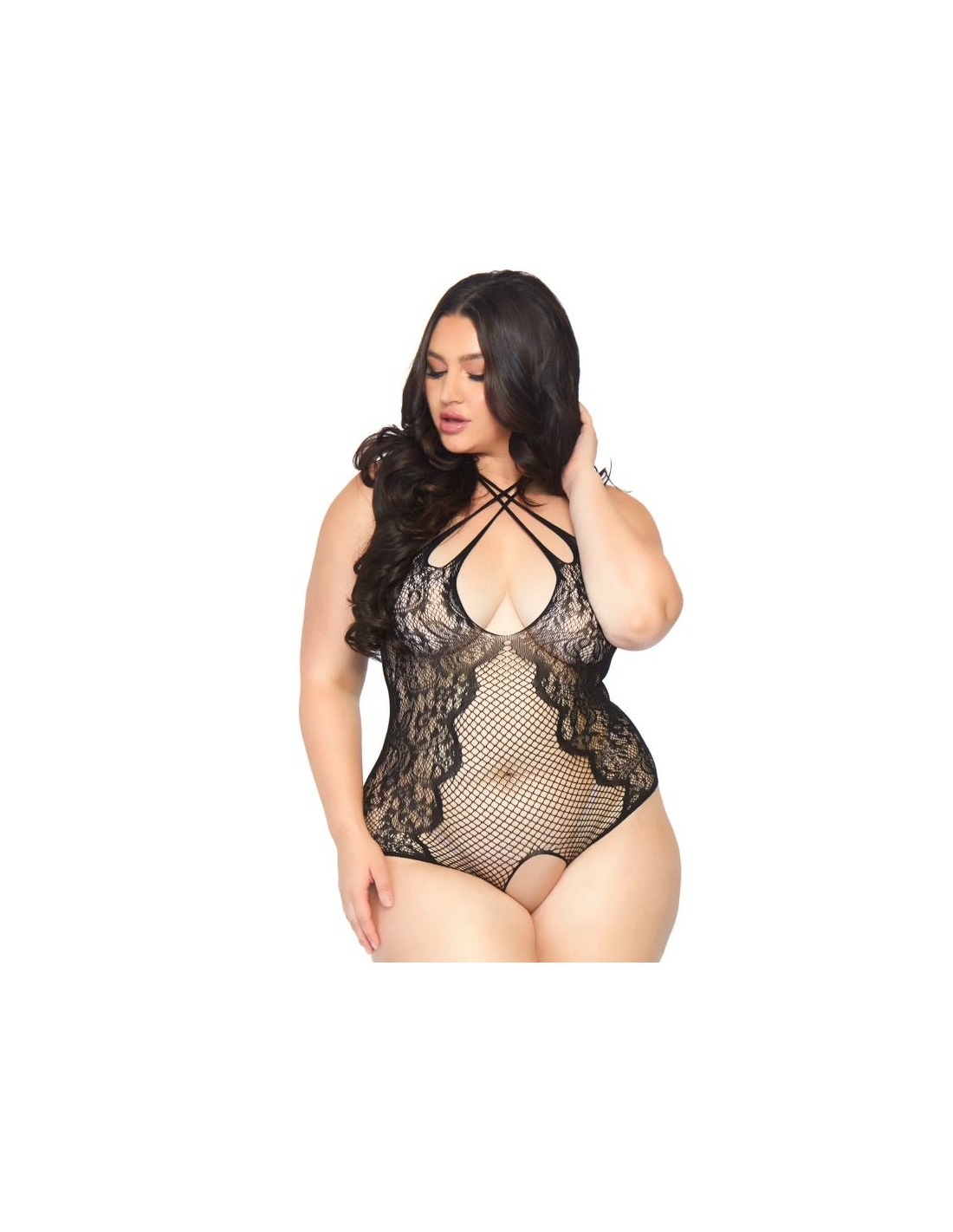 Body de red y encaje sin entrepierna con cuello halter de tirantes y tiras entrecruzadas en la espalda fabricado por la prestigiosa marca de lencería Leg Avenue. Con Leg Avenue reforzarás tu feminidad y obtendrás ese toque justo de seducción, sensualidad y elegancia.