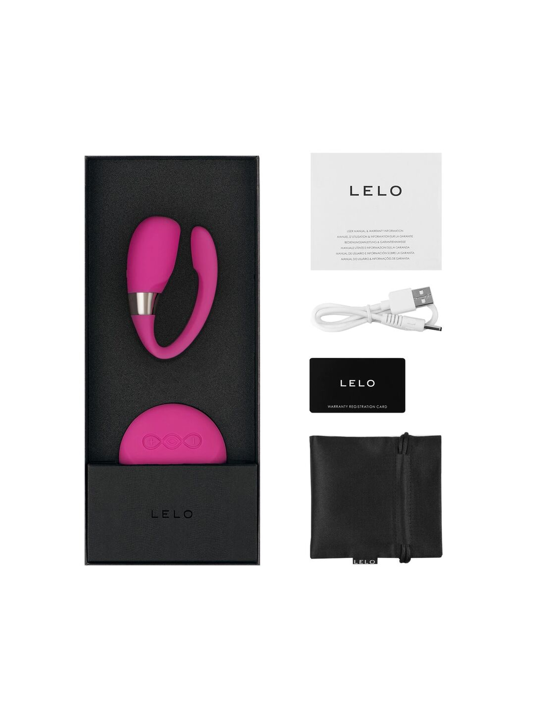 Tiani 3 se presenta en la galardonada caja LELO con su cargador específico del país, una bolsita de satén para guardarlo, lubricante monodosis de regalo y la garantía completa de 1 año