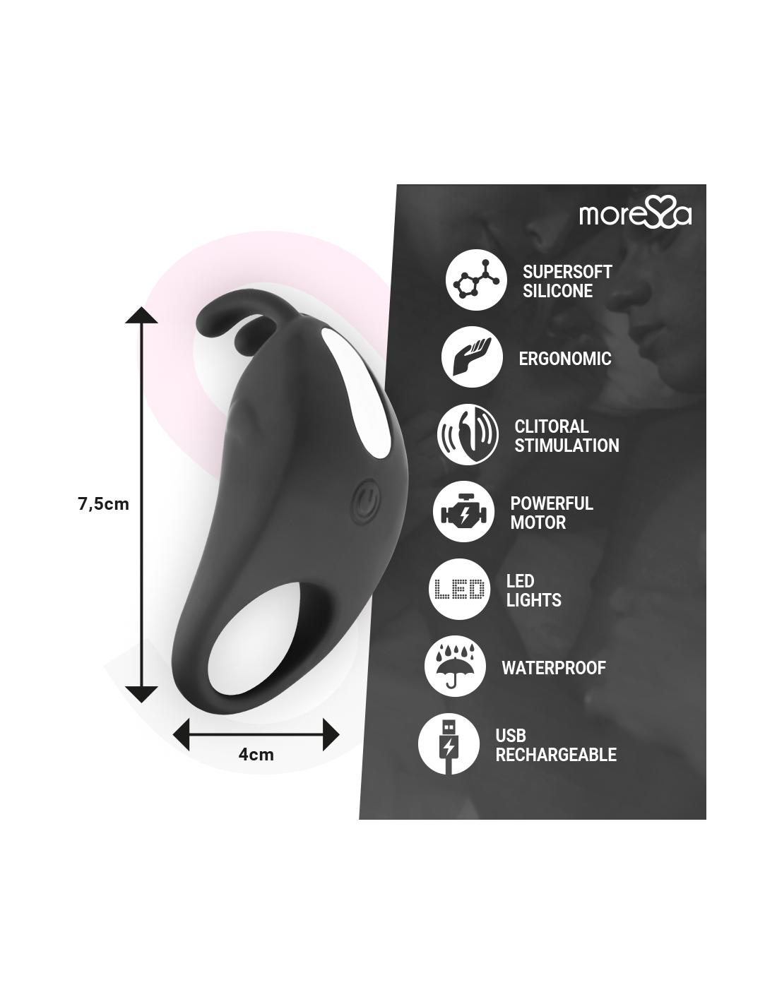 MORESSA- Brad es de fácil colocación gracias a su anilla flexible, tan solo posicionar Brad en la base del pene y activar mediante el botón superior la rotación que proporciona de forma única estimulación clitorial.