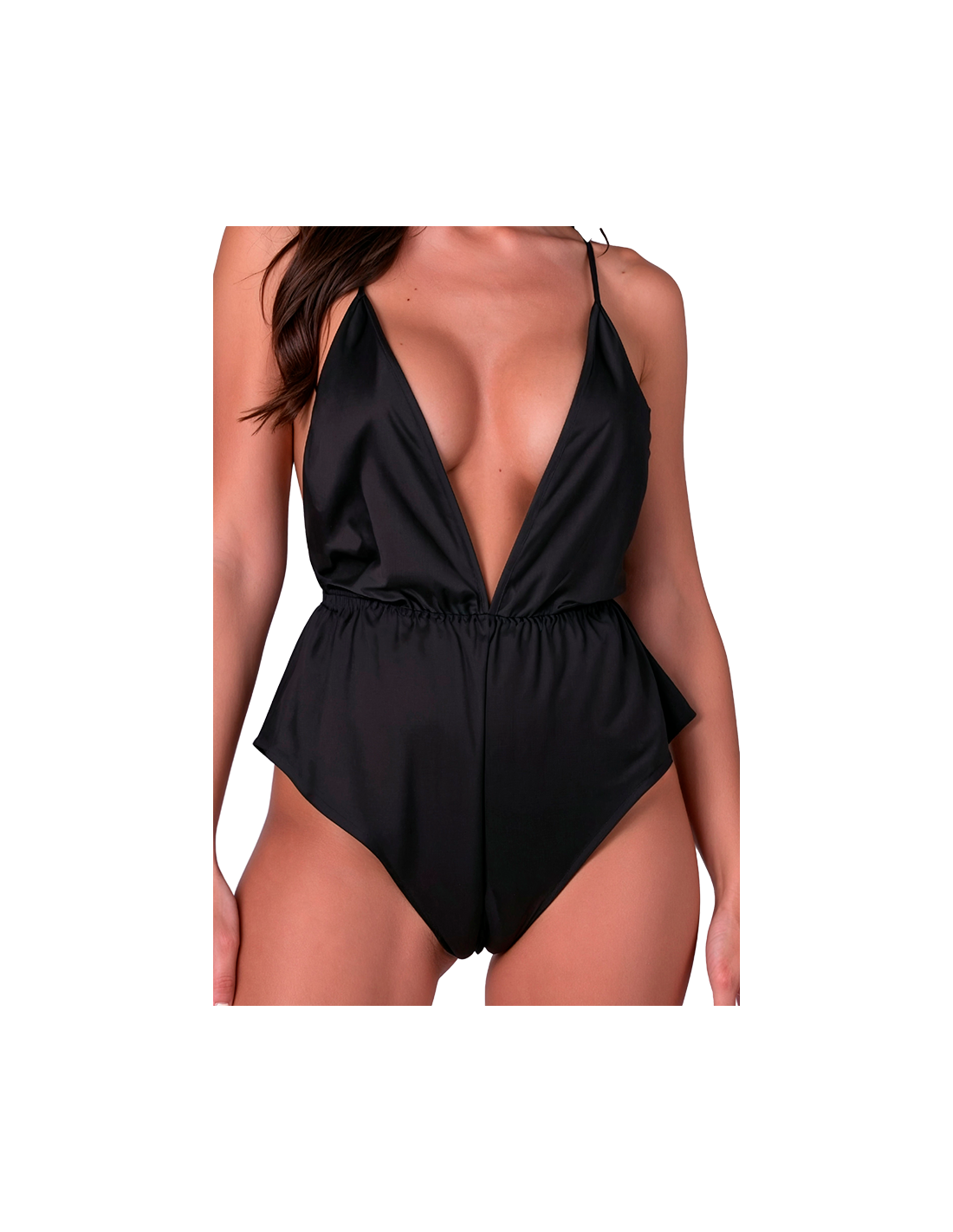 - Estilo: Body satinado con escote en V pronunciado y tirantes cruzados ajustables en la espalda