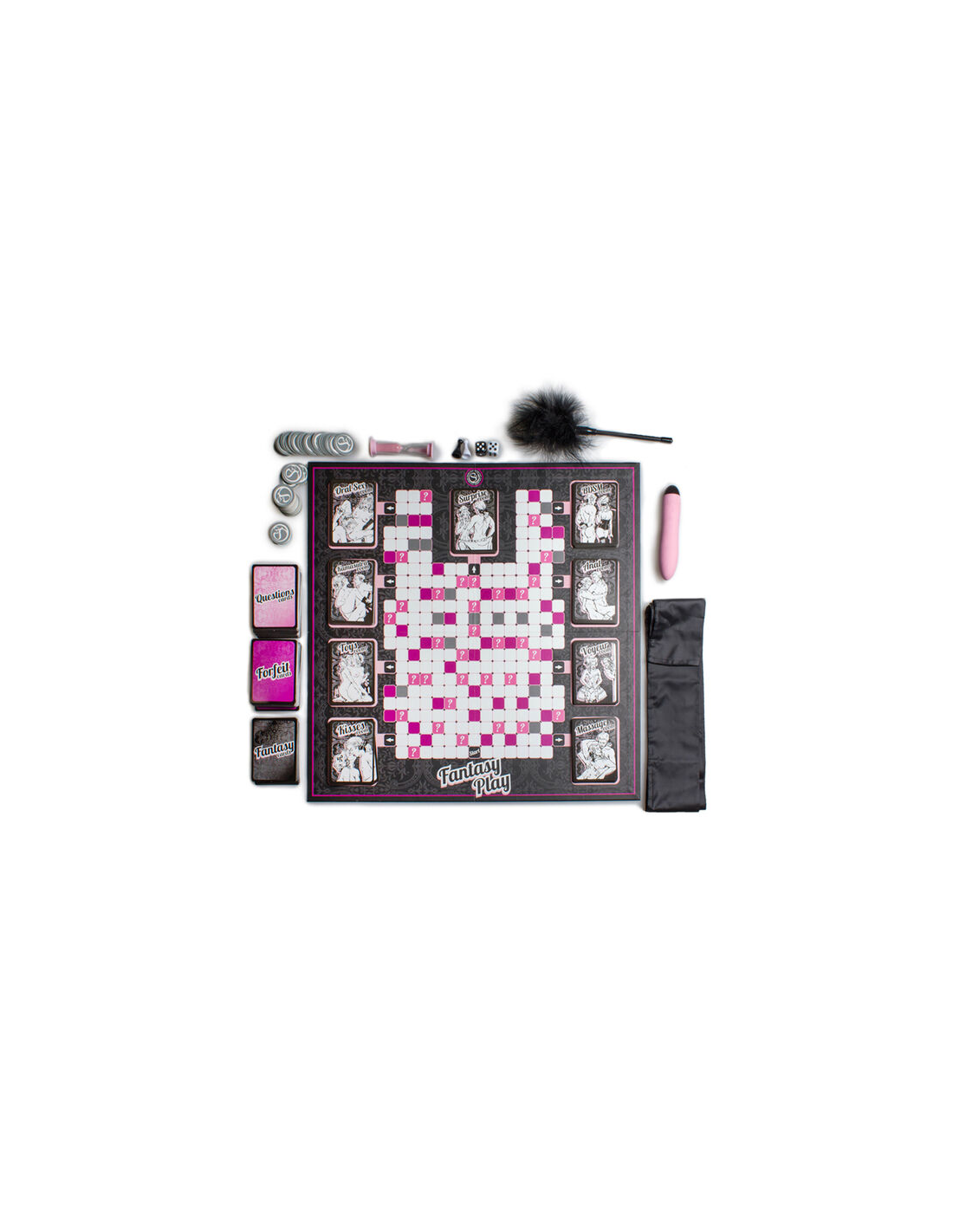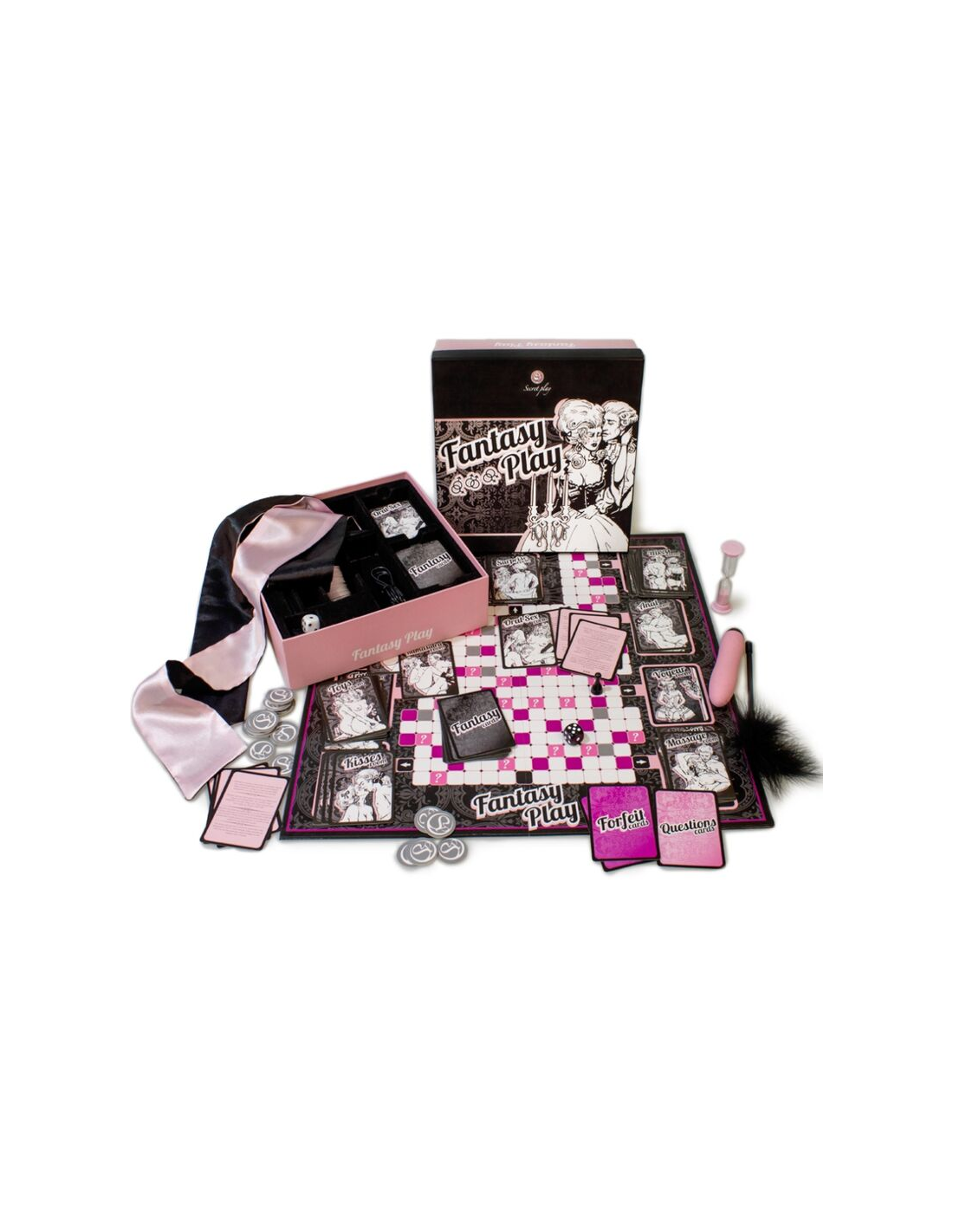 SECRETPLAY 100% GAMESEl juego erótico incluye un tablero con 9 habitaciones temáticas, desde sado hasta voyeur, donde los jugadores exploran las fantasías sexuales mediante tarjetas y pruebas para ganar créditos. El objetivo es descubrir y luego realizar la fantasía sexual de la pareja, usando accesorios como dados, tarjetas, un vibrador, esposas, y más.