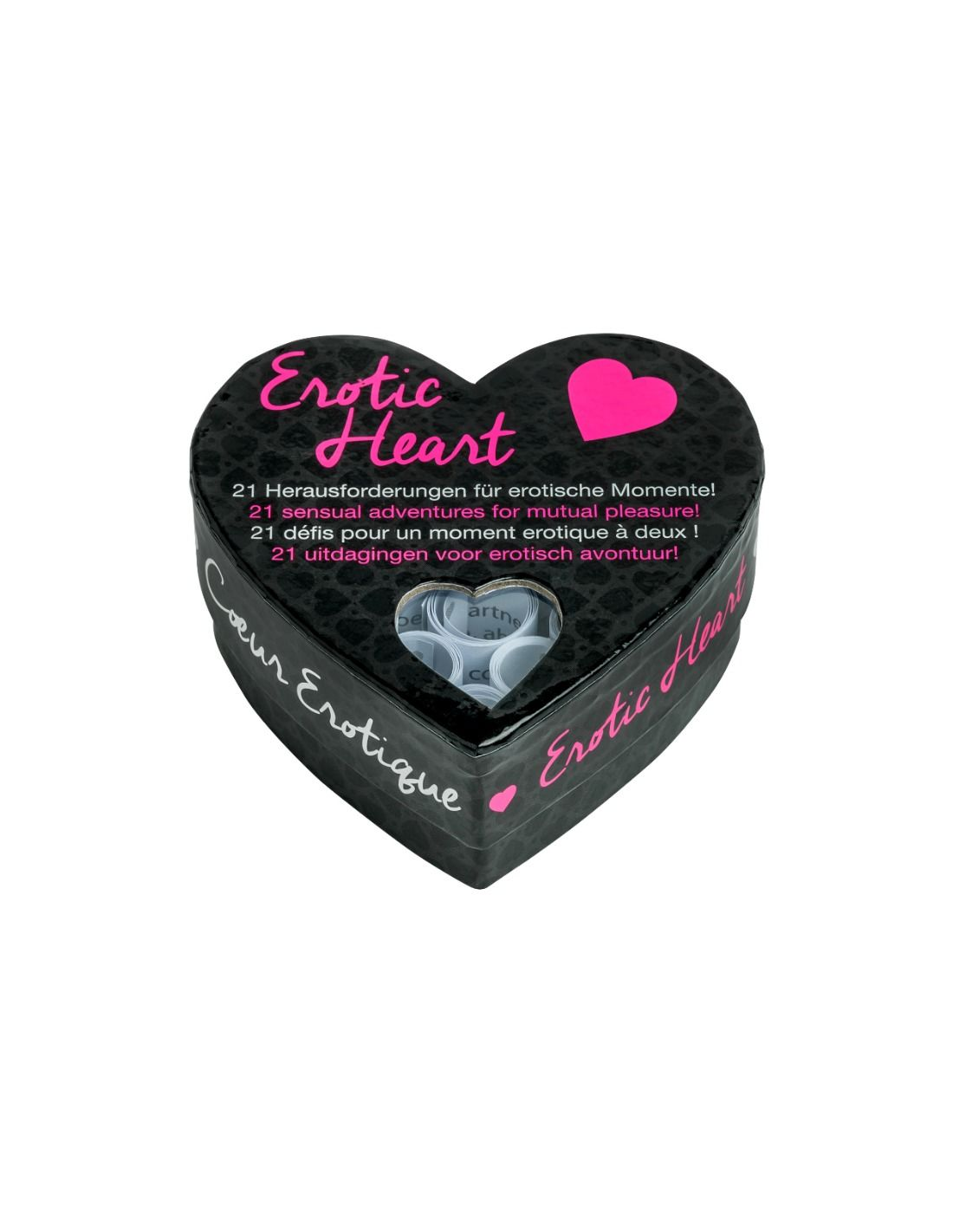 La esencia del Erotic Heart radica en su capacidad para sorprender y seducir. Este juego, presentado en una encantadora caja con forma de corazón, contiene un total de 21 retos que invitan a explorar y disfrutar de la intimidad de una manera divertida y creativa. Cada reto está pensado para fomentar la conexión emocional y física entre los miembros de la pareja, lo que hace que cada experiencia sea única y memorable.